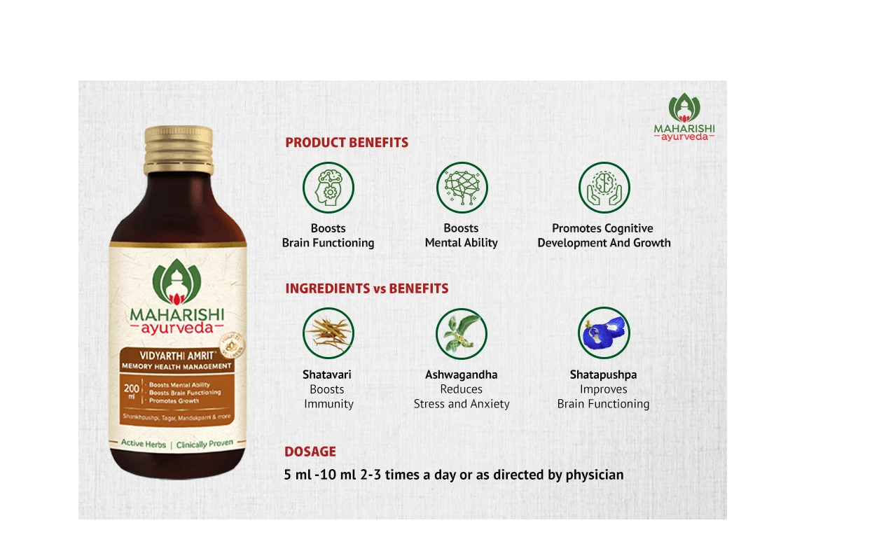 VIDYARTHI AMRIT, has three vital Medhya Rasayanas (rejuvenators) to energize, improve and invigorate Medha i.e. intelligence by promoting the power of cognition, reception and the power to store and recall.